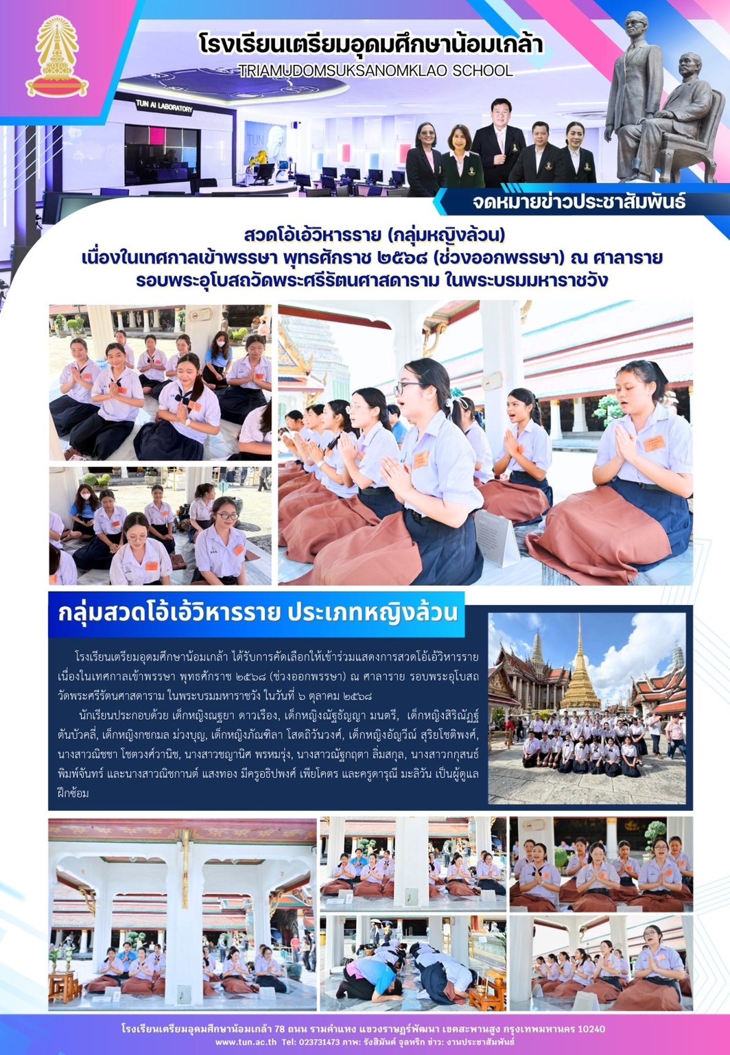 สวดโอ้เอ้วิหารราย (กลุ่มหญิงล้วน) เนื่องในเทศกาลเข้าพรรษา พุทธศักราช ๒๕๖๘ (ช่วงออกพรรษา) ณ ศาลาราย รอบพระอุโบสถวัดพระศรีรัตนศาสดาราม ในพระบรมมหาราชวัง