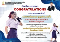 นักเรียนเรายอด :ได้รับรางวัลระดับเหรียญทอง การแข่งขันขับร้องเพลงสากลหญิง ระดับมัธยมศึกษาตอนปลาย