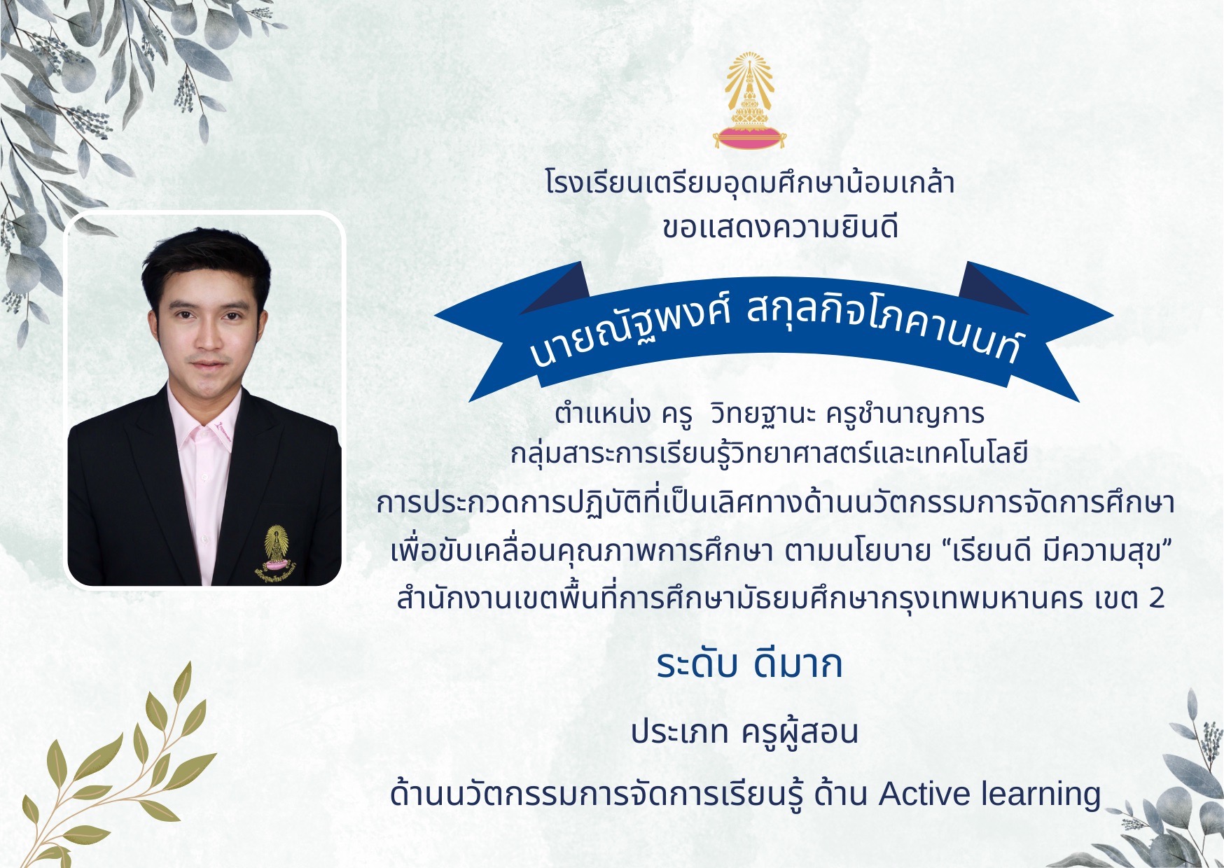 ชื่อผลงาน : รางวัลระดับดีมาก ผลการปฏิบัติที่เป็นเลิศทางด้านนวัตกรรมการจัดการศึกษาเพื่อขับเคลื่อนคุณภาพการศึกษา ตามนโยบาย "เรียนดี มีความสุข" สพม. กท 2