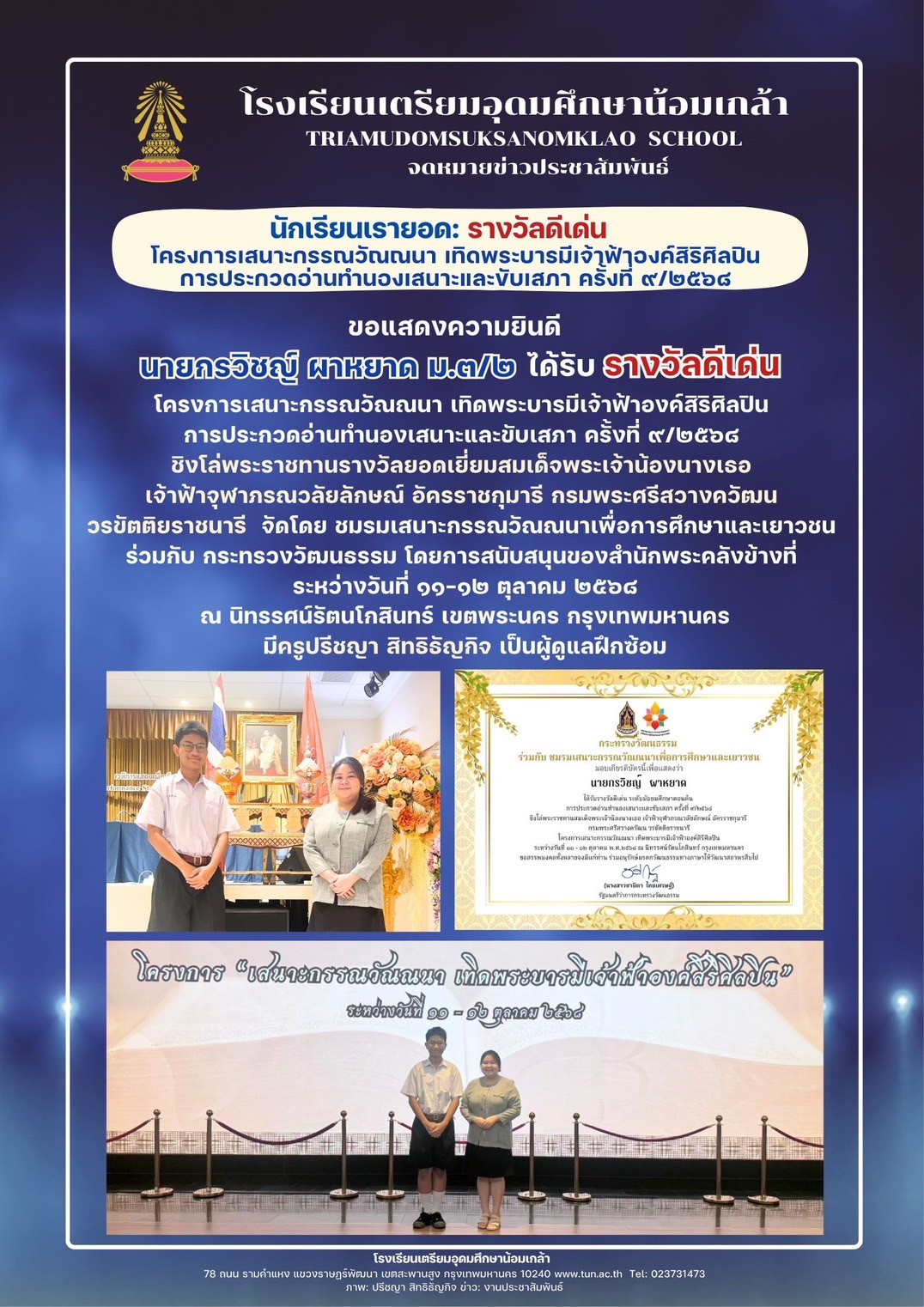 นักเรียนเรายอด: รางวัลดีเด่น โครงการเสนาะกรรณวัณณนา เทิดพระบารมีเจ้าฟ้าองค์สิริศิลปิน การประกวดอ่านทำนองเสนาะและขับเสภา ครั้งที่ ๙/๒๕๖๘
