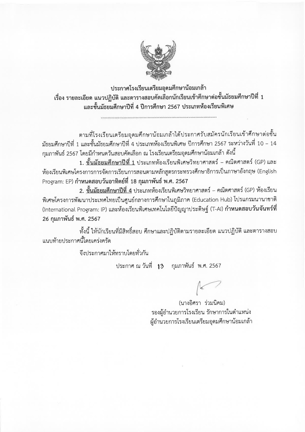 แจ้งรายละเอียด แนวปฏิบัตื และตารางการสอยคัดเลือกนักเรียน ม.1 และ ม.4 ปีการศึกษา 2567 ประเภทห้องเรียนพิเศษ