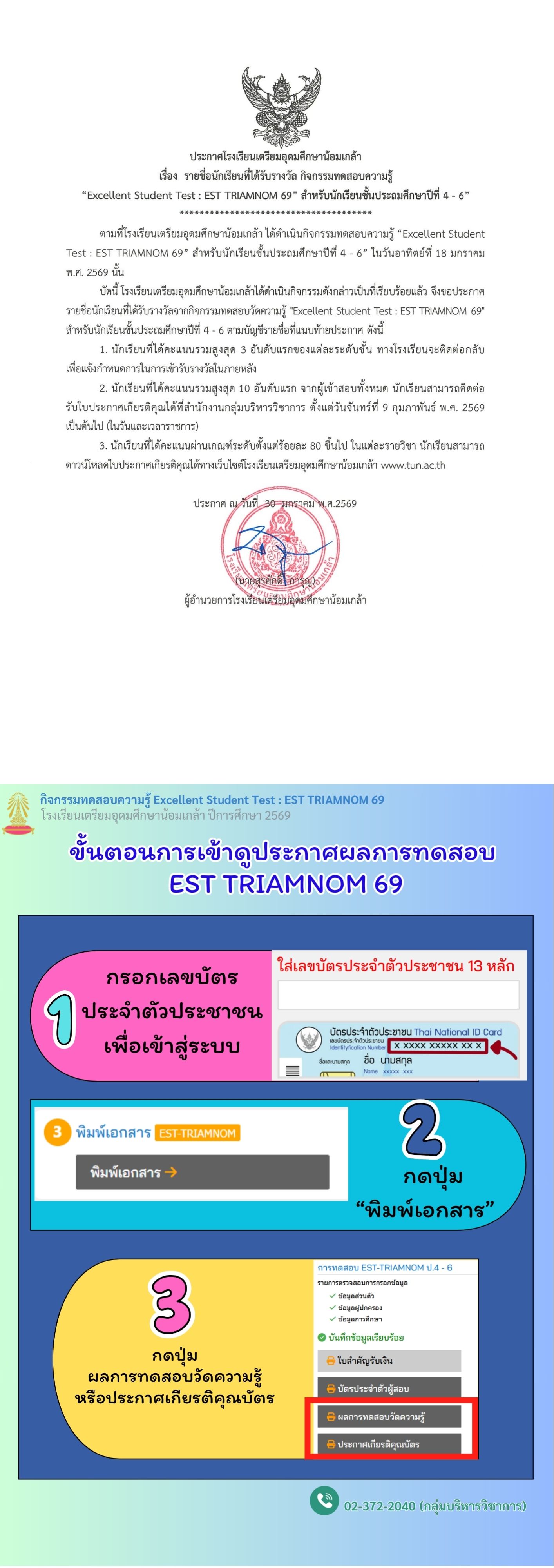 ประกาศรายชื่อนักเรียนที่ได้รับรางวัล และผลการทดสอบ EST TRIAMNOM 69