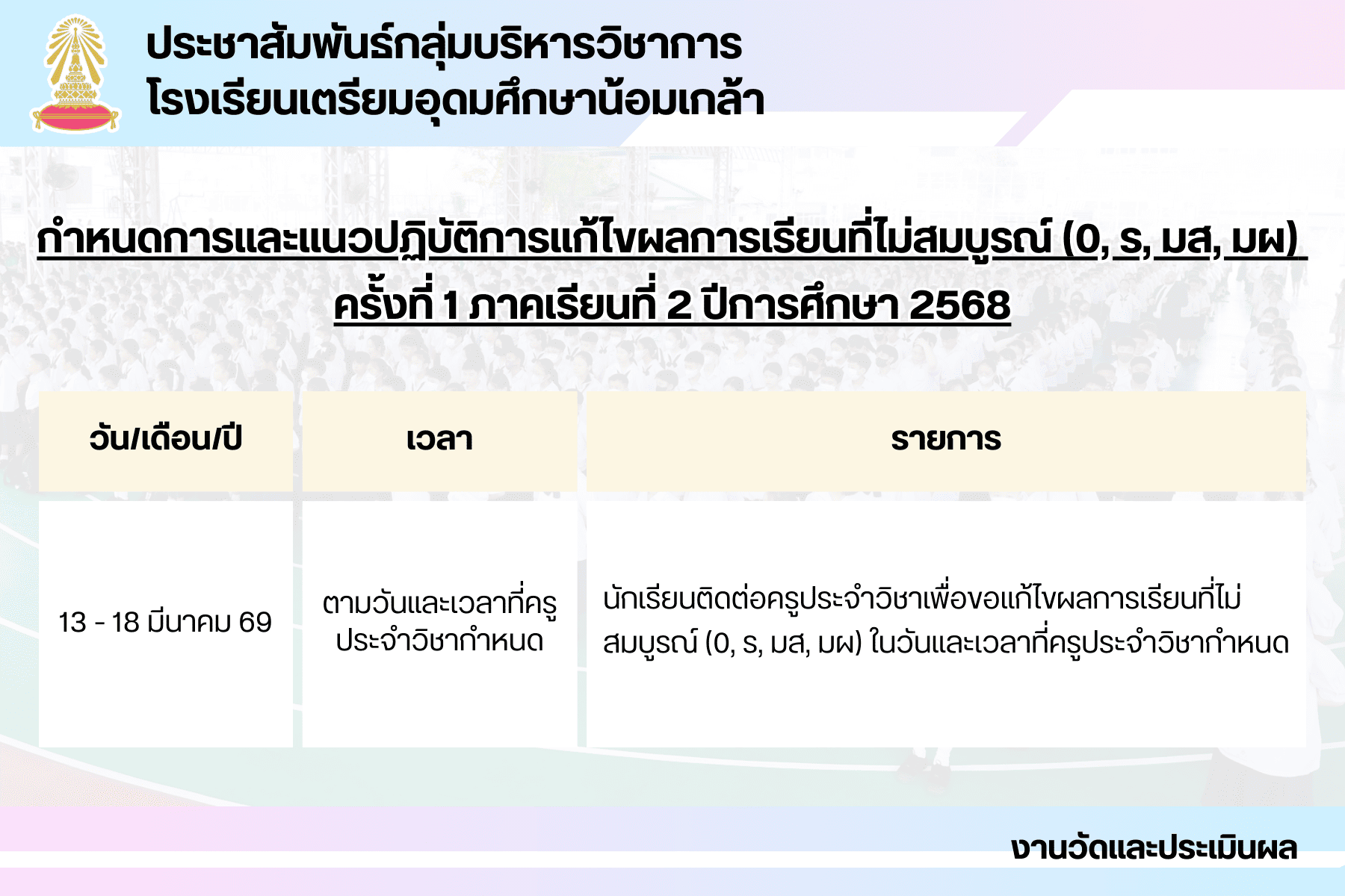กำหนดการและแนวปฏิบัติการแก้ไขผลการเรียนที่ไม่สมบูรณ์ ครั้งที่ 1 ภาคเรียนที่ 2/2568