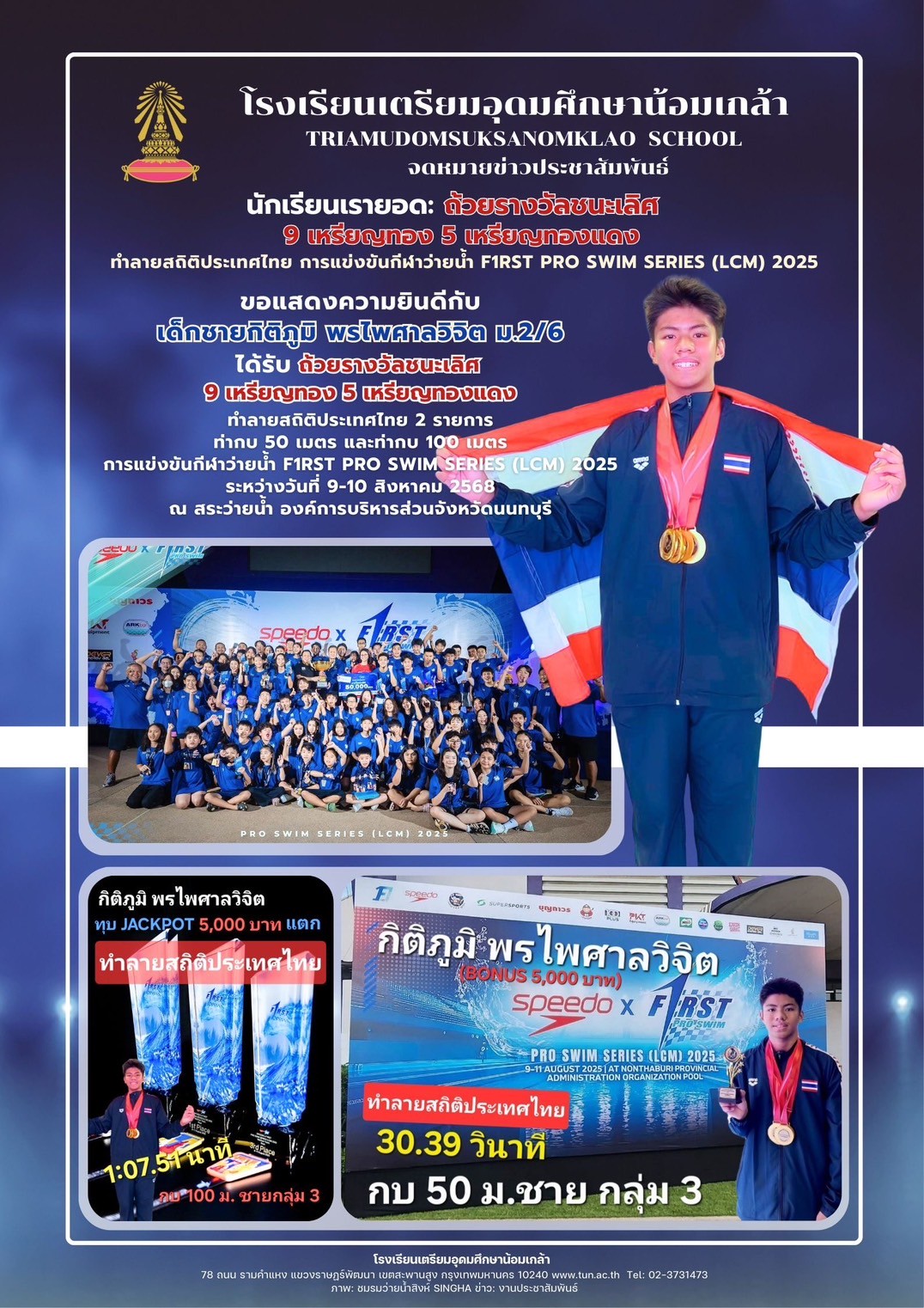 นักเรียนเรายอด: ถ้วยรางวัลชนะเลิศ 9 เหรียญทอง 5 เหรียญทองแดง ทำลายสถิติประเทศไทย การแข่งขันกีฬาว่ายน้ำ F1RST Pro Swim Series (LCM) 2025