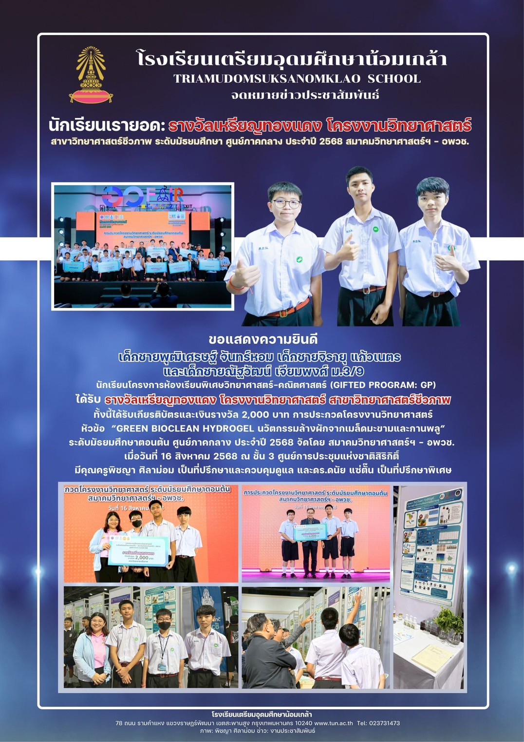 นักเรียนเรายอด: รางวัลเหรียญทองเเดง โครงงานวิทยาศาสตร์ สาขาวิทยาศาสตร์ชีวภาพ ระดับมัธยมศึกษา ศูนย์ภาคกลาง ประจำปี 2568 สมาคมวิทยาศาสตร์ฯ - อพวช.