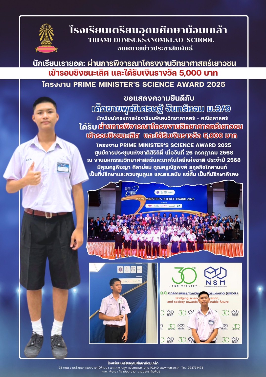นักเรียนเรายอด: ผ่านการพิจารณาโครงงานวิทยาศาสตร์เยาวชน เข้ารอบชิงชนะเลิศ เเละได้รับเงินรางวัล 5,000 บาท โครงงาน Prime Minister's Science Award 2025
