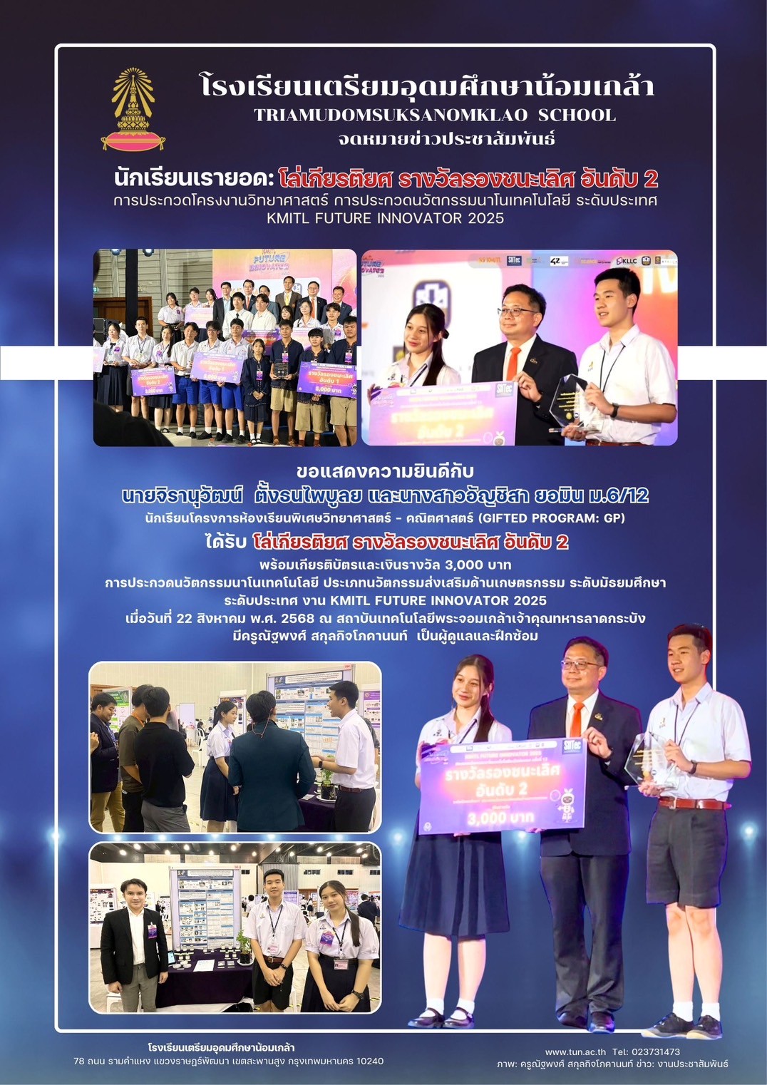 นักเรียนเรายอด: โล่เกียรติยศ รางวัลรองชนะเลิศ อันดับ 2 การประกวดโครงงานวิทยาศาสตร์ การประกวดนวัตกรรมนาโนเทคโนโลยี ระดับประเทศ KMITL Future Innovator 2025
