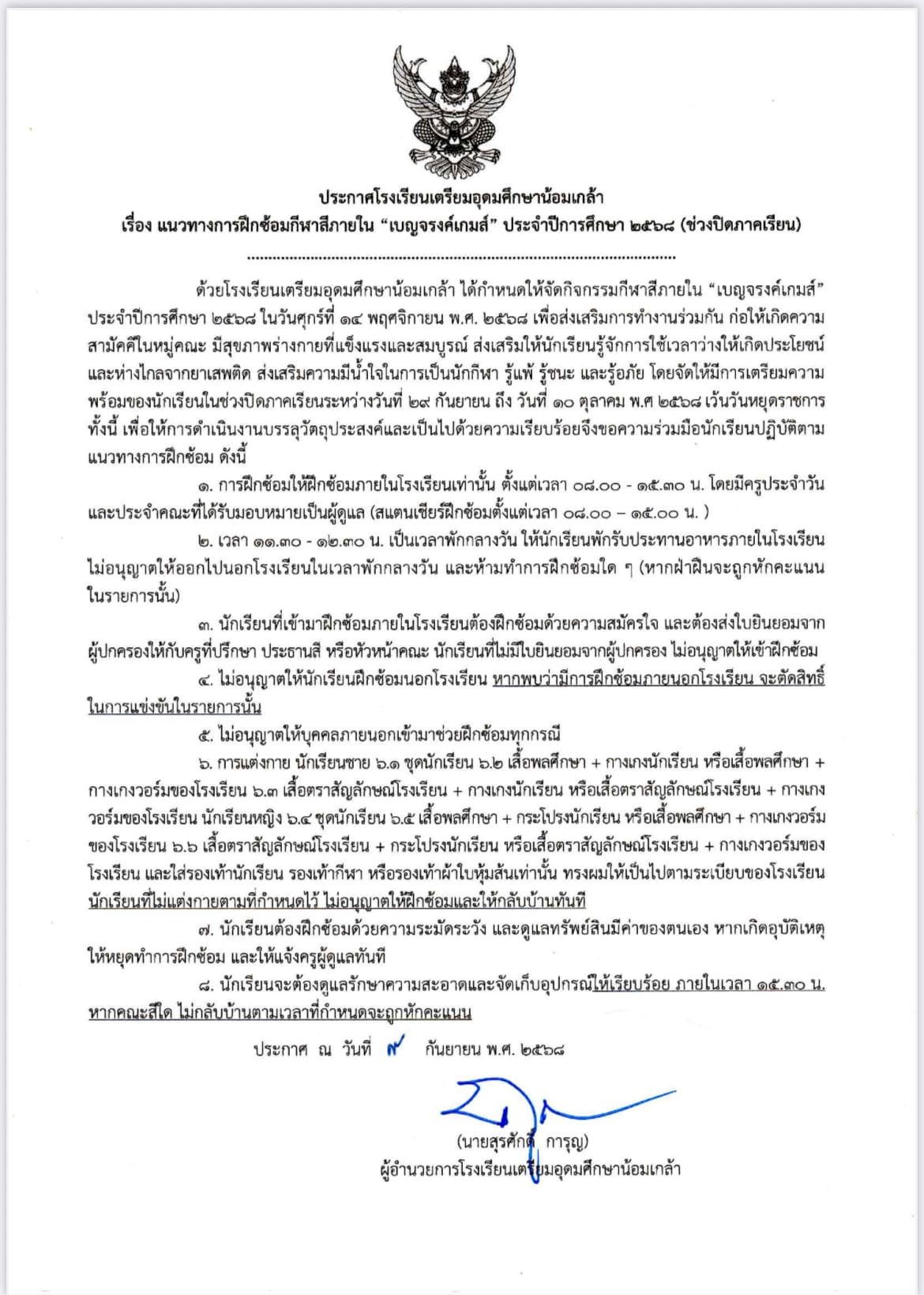 แนวทางการฝึกซ้อมกีฬาสีภายใน ช่วงปิดภาคเรียน