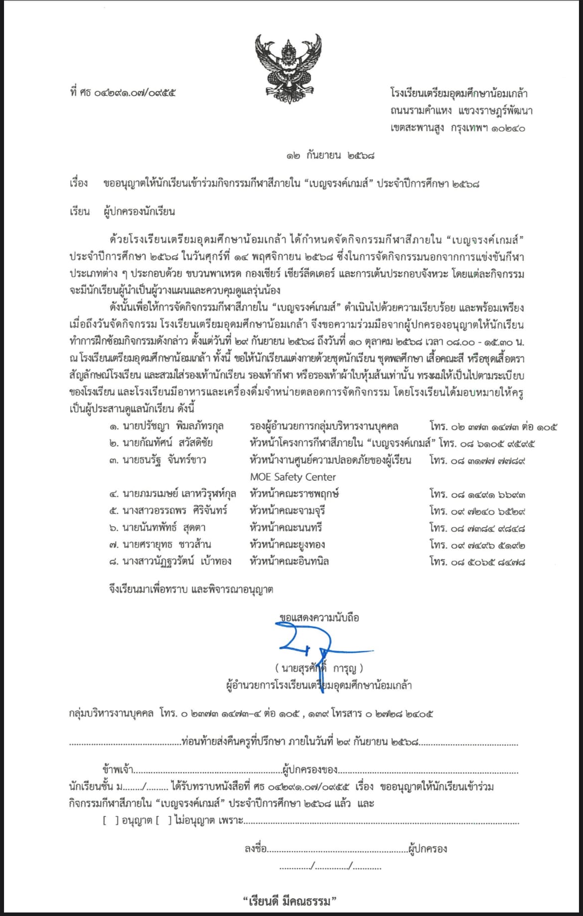 ขออนุญาตให้นักเรียนเข้าร่วมกิจกรรมกีฬาสีภายใน